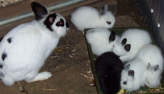 Heeft Zwartoor drie jonkies? Nee, want daar verschijnt nummer 4 en - trippel trippel - ook nummer 5 en ja... daar komt nummer 6! Zes vrolijke konijntjes huppelen om Zwartoor heen. Helemaal puntgaaf, met een mooie dikke vacht en alles erop en eraan. Zwartoor kijkt me trots aan. Net of ze zegt: ik ben een goeie moeder hè?
