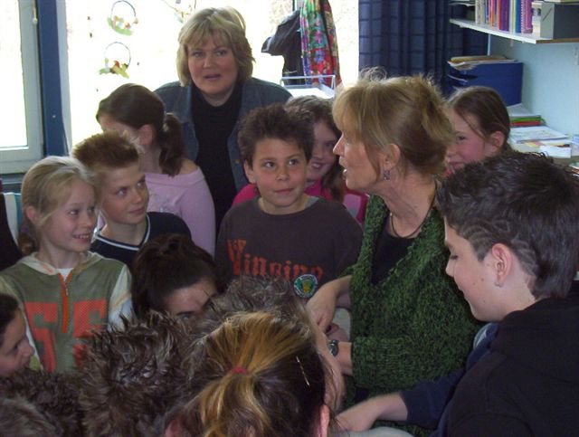 Deze twee foto's zijn van basisschool d'r Durpel in Kerkrade. Een muur vol plaatjes die van deze website waren gehaald en opgeplakt. Op de andere foto signeer ik een boek. Eén van de kinderen vroeg: 'heeft u wel eens een boek overgeschreven?'