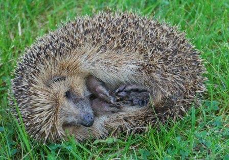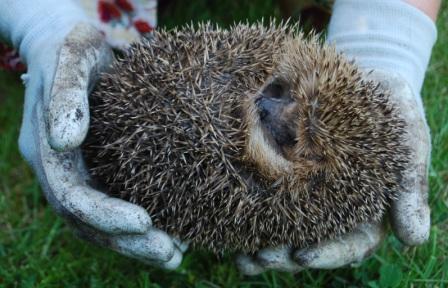 egel. Wij niet! Sinds we hier wonen, alweer heel wat jaartjes, kwam er nooit een egel op visite. Maar sinds kort wel! We zagen haar (of hem) opeens door het gras marcheren. Toen ze ons in de gaten had, schrok ze zich een stekel. Help! en ze rolde zich meteen op. Natuurlijk wilde ik die grappige stekelbal even oppakken en haar onderkant bekijken. Moet je dat schatt ige snoetje zien! Toen ik haar weer op de grond zette, kroop ze langzaam uit haar schulp. Voorzichtig kwamen kop en voetjes weer te voorschijn. Ze draaide zich op haar poten, en hup hup hup verdween met snelle pasjes tussen de struiken. Die avond struinde ze voor de tweede keer door het gras. Maar nu was ze duidelijk minder bang. Ze liep onverstoorbaar verder. Snuffelend prikte ze haar snuit in het gras: sappige insecten en wormen vangen. De volgende middag, 't was heel warm, ontdekten we onze egel aan de rand van de vijver. Zat ze uitgebreid water te slobberen. Hoog op de pootjes trippelde ze langs de waterkant, en weg was ze weer. Ik vond een vreemd drolletje in het gras. Een egeldrolletje? Het was zwart en langwerpig met een puntje. Dat moest dus even uiteen gepeuterd worden. Er zaten restjes van insecten in: vleugels en pootjes. Sinds een paar dagen hebben we onze egel niet meer gezien. Zou ze nog in de tuin zijn? Maakt ze misschien een nest? Als dat eens waar