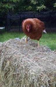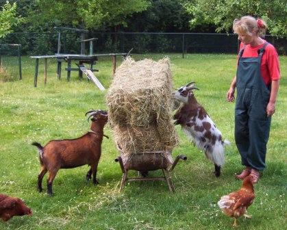| Vrijdag 13 juni 2008 Dieren willen wat beleven! Zien ze me aankomen met nieuwe hooibalen, dan raken ze door het dolle. Hoi, vers hooi! Het is de kunst om het hek op een kier te zetten, de kruiwagen het veld op te rijden en vlug het hek weer dicht te doen... zonder dat de geiten ertussenuit piepen. Aai...dit keer was Betsie, dat is die gevlekte, me te snel af. Ze glipte tussen kruiwagen en hek naar buiten, onze tuin in. Hè, hè, kan ik eindelijk eens van al die mooie, lekkere planten snoepen! moet ze hebben gedacht. Overal nam ze gehaast een hap van. Een hap hier, een hap daar, dan weer verderop - hap hap hap hap. Alsof ze in zo kort mogelijke tijd zoveel mogelijk wilde proeven. Mekkie stond aan de andere kant van het hek sip toe te kijken. Stikjaloers was ze. Die aanlokkelijke, verboden tuin, daar wilde ze óók heen! Het viel niet mee om die slimme Betsie weer terug in de wei te krijgen. Het leek 'pak me dan als je kan'. 'k Heb als een wilde rondgerend. Links en rechts bokkensprongen moeten maken. Uiteindelijk kreeg ik haar te pakken. Met veel sjorren en trekken duwde ik Betsie terug door het hek. Enthousiast huppelde ze meteen naar de kruiwagen met hooi, en Mekkie ook. Alsof er niets was gebeurd. Hé, kijk, vers hooi, interessant, hap hap, lekker! Ook Moeke de kip kwam aangerend. Zo lenig als een geit hipte ze op de hooibaal om nog snel een graantje mee te pikken. |
