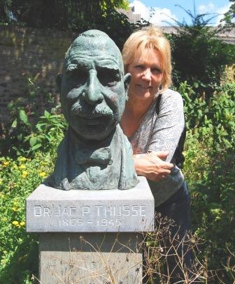 | Maandag 14 juli 2008 In hartje Maastricht ligt aan een schilderachtig pleintje het Natuurhistorisch museum. Het was eigenlijk veel te mooi weer voor museumbezoek, maar 'k ben toch even binnengewipt. Een museum over de Limburgse natuur, vroeger en nu, altijd leuk. Heb allerlei fossielen bewonderd uit de tijd dat Limburg een tropische zee was (het boven-krijt: 71 - 65,4 miljoen jaar geleden). Het fossiel van de mosasaurus hing er, grijnzend, en zeker 10 meter lang. Een zwemmende vleeseter uit de prehistorie die met een bek vol scherpe tanden de beest uithing. Een lekkere griezel. Ook kasten vol insecten-, spinnen- en plantenverzamelingen. Die hebben Limburgers na hun dood aan het museum nagelaten. Ik nam nog even een kijkje in een nagebouwde mergelgroeve. Maar al vrij snel liep ik in het zonnetje. Want rond het museum ligt een heemtuin. Ik ben gek op tuinen. De dikke paar denkastanje was duidelijk ziek. Allemaal trieste bruinige bladeren: de grote plaag van veel wilde kastanjes. Boosdoener is de paardenkastanjemineermot. Een lange naam voor een klein (maar mooi bruin-zwart-wit) vlindertje. Ze legt eitjes op het blad. Haar jonkies, minuscule rupsen, vreten zich hongerig naar binnen en graven gangen om verder te schransen. Lekker voor hen, maar pech voor de boom. Opgegeten door een klein beestje! De tuin zag er een beetje verwaarloosd uit. En bijna nergens naambordjes bij de planten! Dat is nu juist zo leuk in een heemtuin: dat je je plantenkennis van planten uit je omgeving bijspijkert. Maar Jac. P. Thijsse maakte alles weer goed! Met dat vriendelijke ei-ronde hoofd prijkt hij op een zuiltje, midden in de tuin. Thijsse bracht de mensen belangstelling en liefde voor de natuur bij. Zijn leven lang vertelde en schreef hij over zijn passie voor plant en dier. Oude mensen kennen nog zijn Verkade-albums of die dikke groene Flora van Nederland (Thijsse is al meer dan 60 jaar dood). Met leerlingen (hij was ook een brave schoolmeester) en nog vele anderen trok hij de natuur in. Híj was het die een echte vereniging wilde oprichten om onze natuur te beschermen. Aanleiding: Amsterdam lanceerde het plan een vuilstortplaats te maken van het Naardermeer. De gemeente vond het een waardeloze plas! Ja zeg... Zo kwam in 1905 de Vereeniging tot Behoud van Natuurmonumenten ter wereld. Die bestaat nog steeds. Bij deze bevlogen, besnorde natuurfreak (mét vlinderdasje: dat droeg hij ook als hij ging wandelen) wil ik graag in de schaduw staan. |
