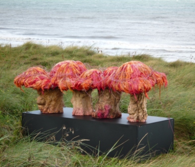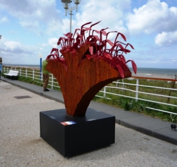 Zaterdag 6 september 2008 Langs de kust bij Kijkduin staan prachtige kunstvoorwerpen. Natuurkunst, gemaakt van boomschors, takken, bladeren, schelpen, kurk, touw... 'Die rotzooi verpest me uitzicht', bromde een man op het terras tegen een paar mooie rode paddestoelen. Daar stonden ze, op stelen van knoestige boomstammetjes. Elk met een hoed van drie kleuren pampusgras. Die reuzenvaas op de foto hiernaast is van dezelfde maker, Peter van der Sluis als ik me goed herinner. Een vaas van stukken boomschors met bovenop palmschubben die de lucht in prikken. Alles prachtig donkerrood gespoten. Dat raam van witte berkenstammen (van Karin Bunnik) is net een gordijn. Als je erlangs loopt, lijkt het of het gordijn beweegt. Je ziet de zee en de wolken er nog net doorheen. Straks gaan de dertig kunstwerken terug. Tentoonstelling voorbij. Dan zijn boulevard en duinen weer kaal en heeft die brombeer op het terras zijn uitzicht terug. |