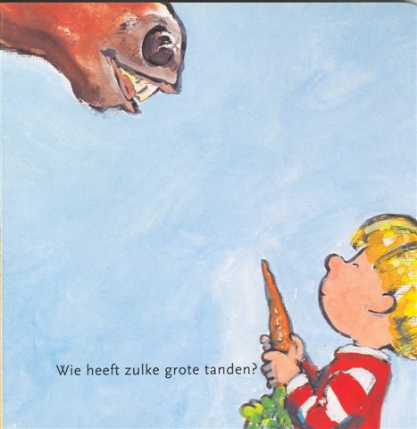 Hardkartonnen, vierkant prentenboekje met twee afgeronde hoeken, waarin op elke rechterpagina de achterkant van een boerderijdier te zien is, elke keer stelt hetzelfde, gezellig uitziend jongetje daar een vraag over, b.v.: 'van wie is die krulstaart?' Na omslaan, is de voorkant, of het hele dier te zien en het geluid te lezen, dat het voortbrengt: 'knor knor'. Na het varken passeren het schaap, de eend, de kip en het paard de revue en tot slot wordt de vraag gesteld: 'en van wie zijn die twee handjes? Die zijn van... jou!' Een fijn aanwijsboek voor jonge peuters met een speelse inhoud om eerst te bekijken, dan de vraag te beantwoorden, kijken of het klopt en vervolgens de geluiden na te bootsen. Het kind zal de benoemde dieren al snel herkennen uit zijn omgeving of van de (kinder)boerderij. De sterke illustraties in waterverf tonen de dieren zoals ze er in het echt uitzien maar hebben een expressieve gelaatsuitdrukking. Vanaf ca. 1,5 jaar.