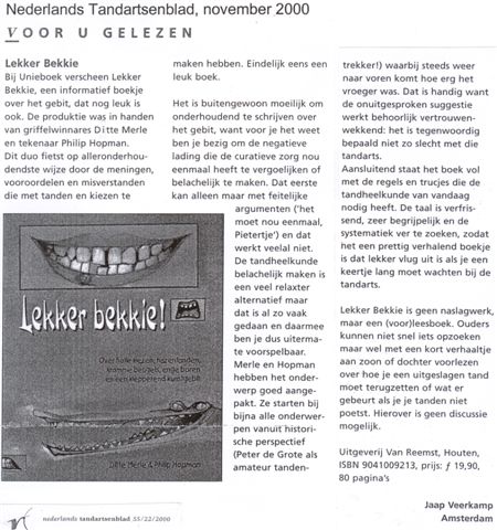 Het boek Lekker bekkie! is een paar keer besproken in een tandartsenblad. Daarna hoorde ik opeens van verschillende mensen, dat ze het boek bij hun tandarts hadden zien liggen. Die tandartsen hadden het artikel natuurlijk gelezen en het boek voor hun wachtkamer aangeschaft. Zo zie je dat zo'n bespreking handig is voor de verkoop.